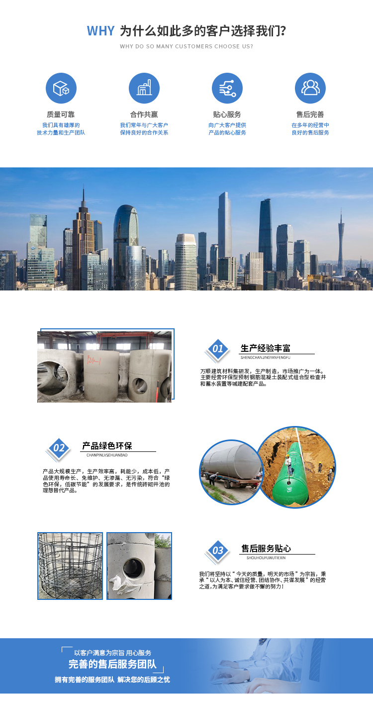黃山市萬順建筑科技有限公司是集研發(fā),生產(chǎn)制造,市場推廣為一體的綜合性企業(yè)。公司主要經(jīng)營環(huán)保型預(yù)制鋼筋混凝土裝配式組合型檢查井和蓄水裝置等城建配套產(chǎn)品。產(chǎn)品生產(chǎn)過程采用獨(dú)特的生產(chǎn)工藝,機(jī)械化流水作業(yè)。產(chǎn)品大規(guī)模生產(chǎn),生產(chǎn)效率高,耗能少,成本低,產(chǎn)品使用壽命長、免維護(hù)、無滲漏、無污染,符合“綠色環(huán)保,低碳節(jié)能”的發(fā)展要求,是傳統(tǒng)磚砌井池的理想替代產(chǎn)品。